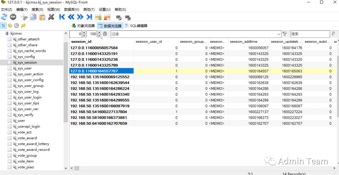 echo self::$perms['sid'];exit;发现这里数据存放在数据库的kj_sys_session表中的session_id字段,而session_user_id表示是否登录在,1表示登录在,0表示退出了登录。