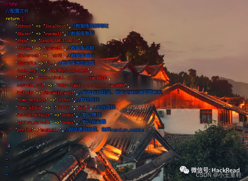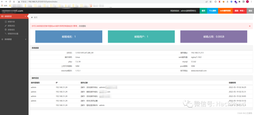 我们访问一下后台,默认账号密码admin/ewomail123,进去先改一下密码。已经绑定好后缀域名了,我们首先添加邮箱用户,这块可以自己看着起名,admin@xxx.com,或者xiaowang@xxx.com,设置好账号密码后可以去http://IP:8000登录看看,到此我们的搭建任务就结束了,联动调试后续讲解。有时候我们搭建好了发现需要换域名的办法,需要替换两个地方,第一个是web管理平台绑定的域名,第二个是配置文件如下图,马赛克部分便是需要改的域名:vim /ewomail/www/ewomail-admin/core/config.php