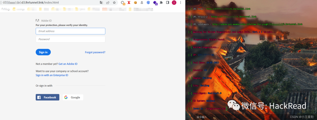 访问测试,成功抓到访问信息,IP地址,设备信息等,如果你属于提交数据的话,也会显示出来,然后会自动跳转到真的官网,数据会记录在两个txt文本中。