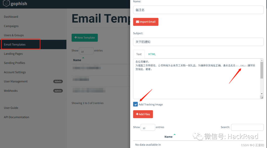 配置完可以点左下角测试发送邮件。然后我们来配置一下文案,有一些需要注意的点 :{{.URL}}可以自动替换为钓鱼链接。打对勾处会自动添加一个图片,当打开邮件时候会自动加载图片用以反馈邮件状态,outlook禁止图片加载,可能会影响数据读取。需要做超链接的话,可以在其他邮件客户端设置一个包含超链接的邮件,再导入gophish,平台会自动把超链接转换为钓鱼网页,导入方法:把导出的eml文件以文本打开,复制文本到ImportEmail,之后想修改文案的话,在HTML模式下修改即可![]()