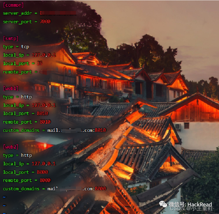 [common]bind_addr = 0.0.0.0bind_port = 7000bind_udp_port = 7001kcp_bind_port = 7000vhost_http_port = 80vhost_https_port = 443dashboard_addr = 0.0.0.0dashboard_port = 7777 /*管理页面*/dashboard_user = admindashboard_pwd = !@#$QWER....
