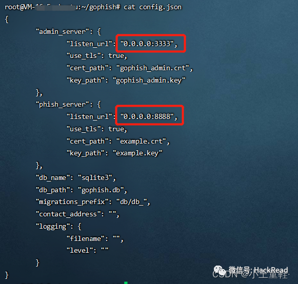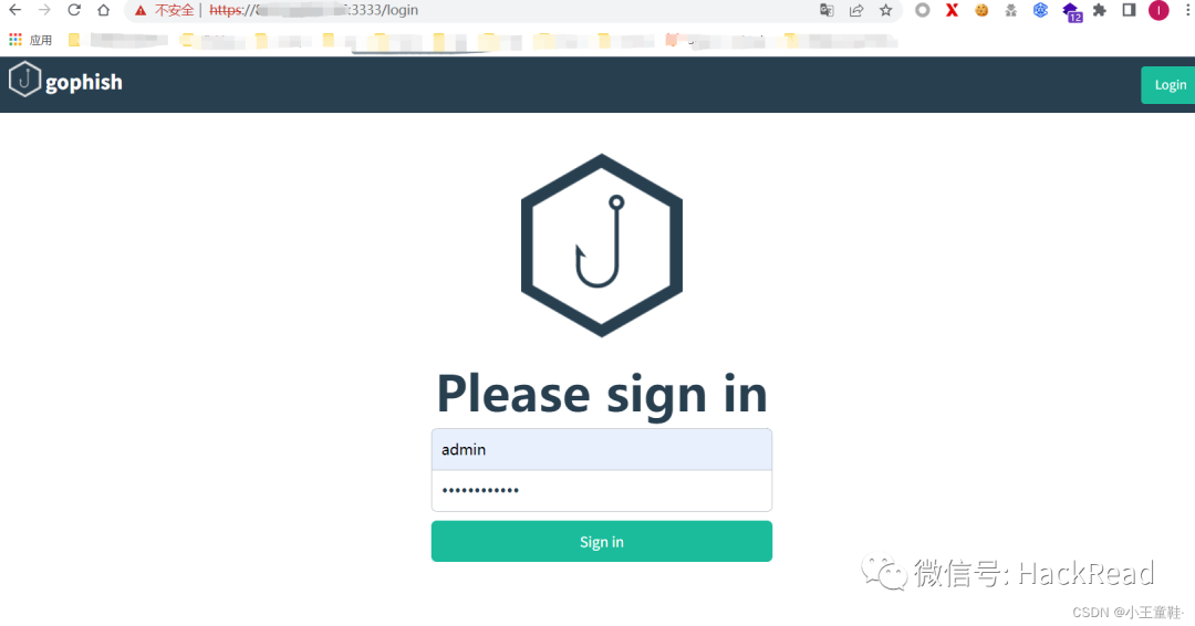 给予文件777权限,cd进目录后我们可以看到config.json,这个是gophish配置文件,chmod -R 777 gophishcd gophishls解读一下配置文件,gophish会主起两个端口,一个3333是后台管理端口,我们把127.0.0.1改成0.0.0.0方便我们从公网发起访问,第二个端口为80,我这边因为还起了其他服务怕端口有冲突,所以改成了0.0.0.0:8888。大家改配置之前可以先netstat启动gophish,运行gophish,运行后注意运行界面会显示一个password参数,是后台登录密码,默认账号是admin,此时我们访问:https://服务器ip:3333 /注意是https/随后我们继续访问另一个页面:https://服务器ip:80 ,注意依旧是https,如果配置文件改了端口,就按照改了的来,如下图显示即为成功。