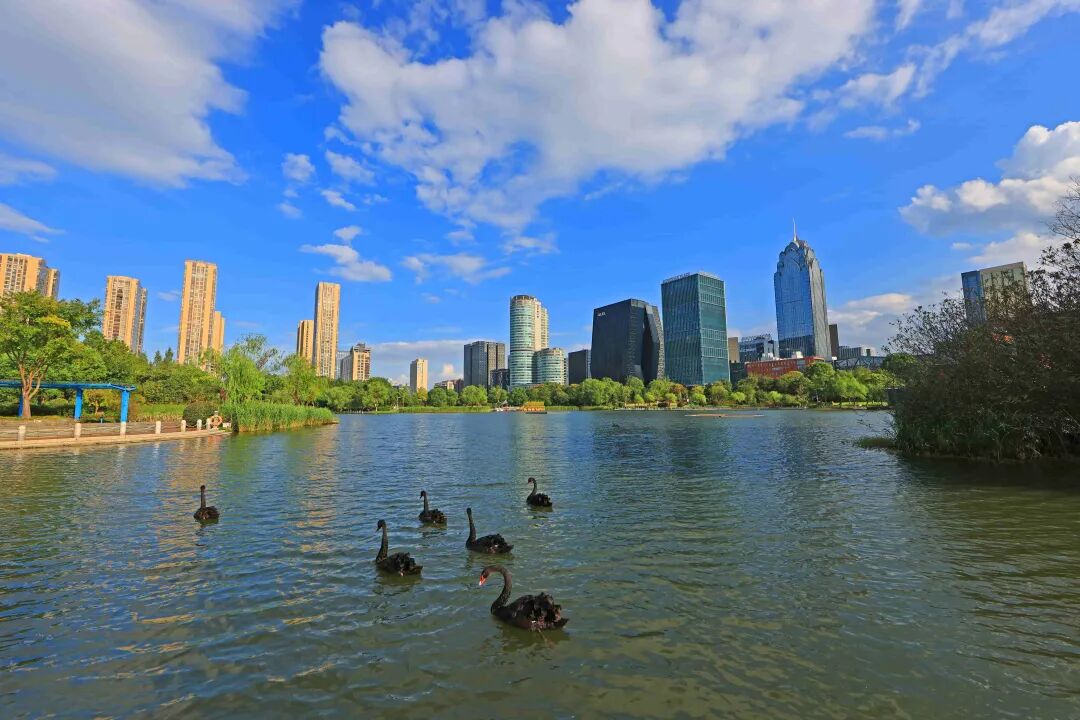 这个位于鄞州中心城区的城市绿肺,湖面宽阔,视野开阔。看霞光从远处的高楼慢慢隐去,近旁的黑天鹅慢慢变成剪影,月亮徐徐上升。躺在丝绒般的草坪上,看明月穿梭在云间,月光皎洁,所有的烦恼早已化为乌有。