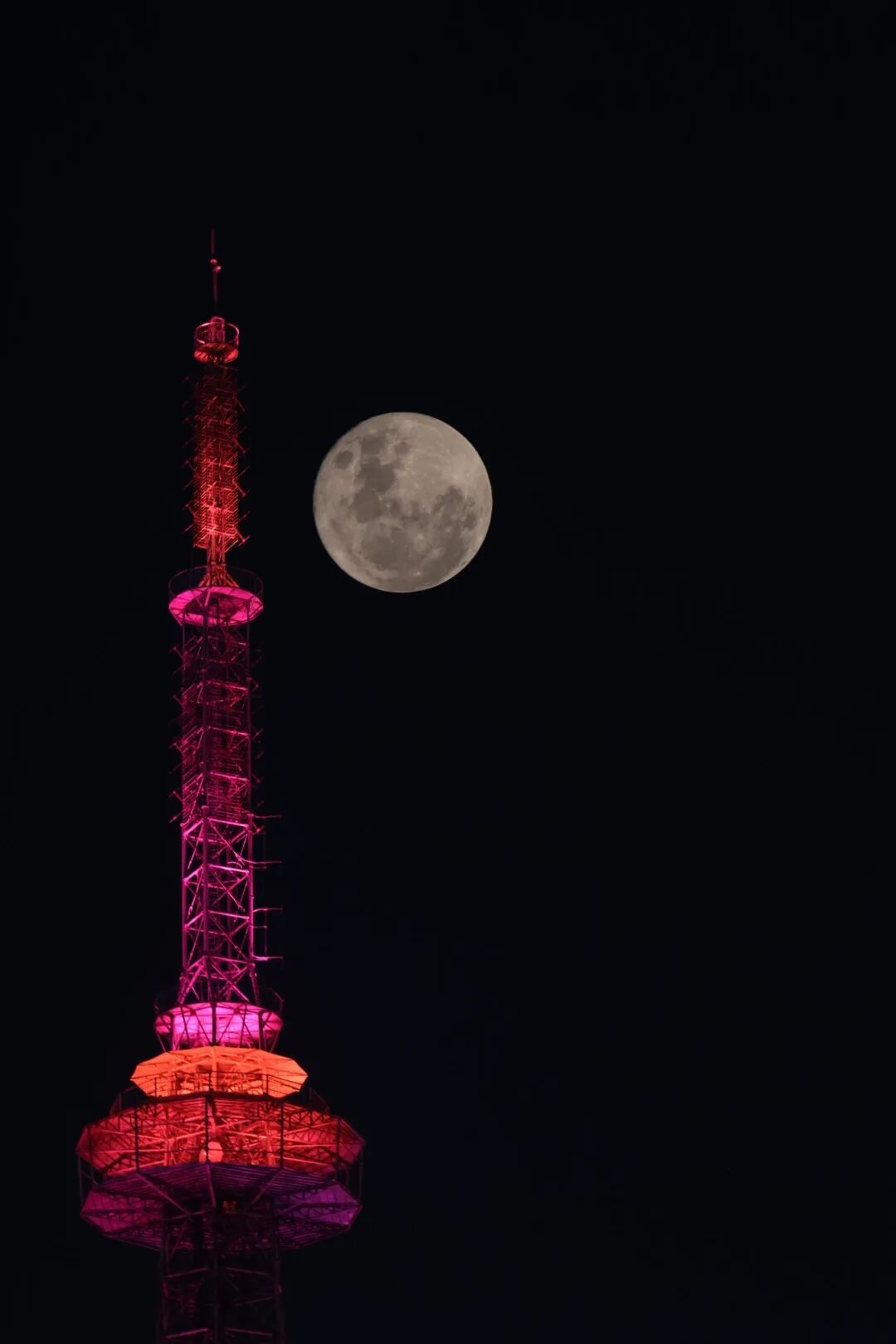 巍峨铁塔,耸入云间,变换着各种色彩。当一轮硕大的皓月升起,依偎在铁塔,有种铁骨柔情的震撼之美。这一刻值得你守候。