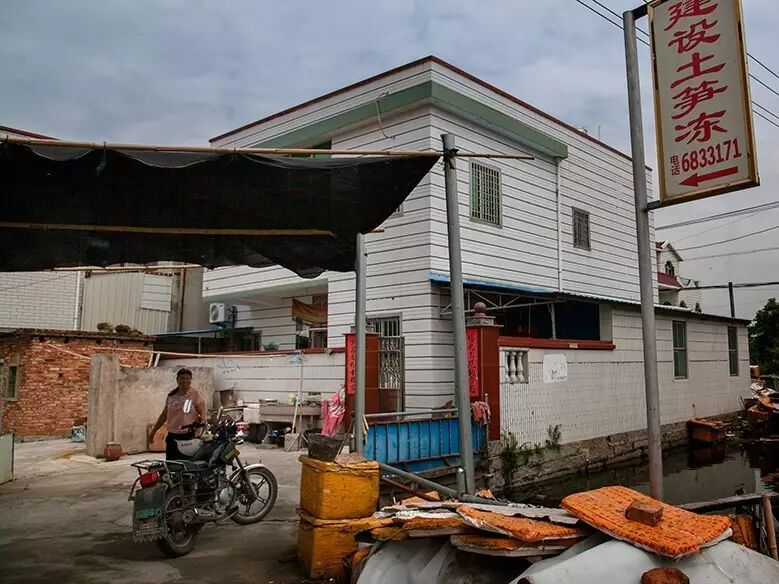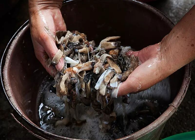 当我来到郭师傅的院子时,里面满是“土笋”,一种腥臭和泥土混合的味道萦绕其间,直插心肺。一部分处理好的“土笋”堆在厂房门口,“活笋”则用装着水的大木盆盛放,摆在靠外的地方,同村的妇女们吃过早饭纷纷来到厂里,踩着泥水坐在木盆旁边准备开始徒手处理这些扭动挣扎着的活物。