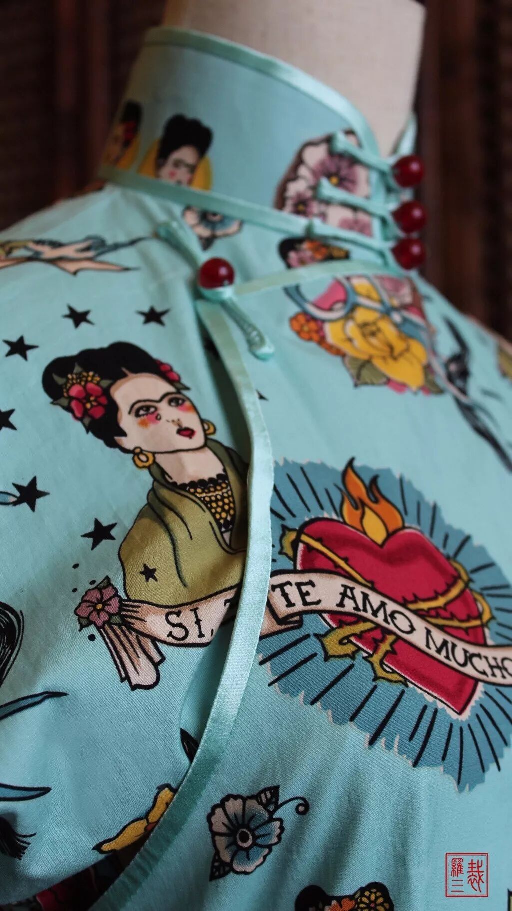 聊起旗袍手艺本身,罗阳觉得没太多可说的。因为旗袍的版式大同小异,区别只在于整体风格。“熟悉我的人,对我家旗袍的辨识度是非常高的。”罗阳觉得自己的特点体现在细节的改动上。比如在旗袍的制作中,除了采用棉布、香云纱这类传统面料外,他也会用些像蕾丝、流苏蕾丝、印度丽人纱等时下流行的面料。此外在旗袍的扣子设计上,他偏好采用玉石。