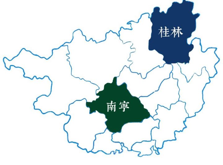 ▲ 现今南宁和桂林在广西地图上的地理位置。图片源自网络