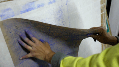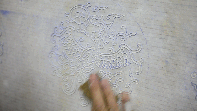▲ 拍完谱子后,透过针眼,那些粉就落在了建筑上,手艺人就可按照这个沥粉了。