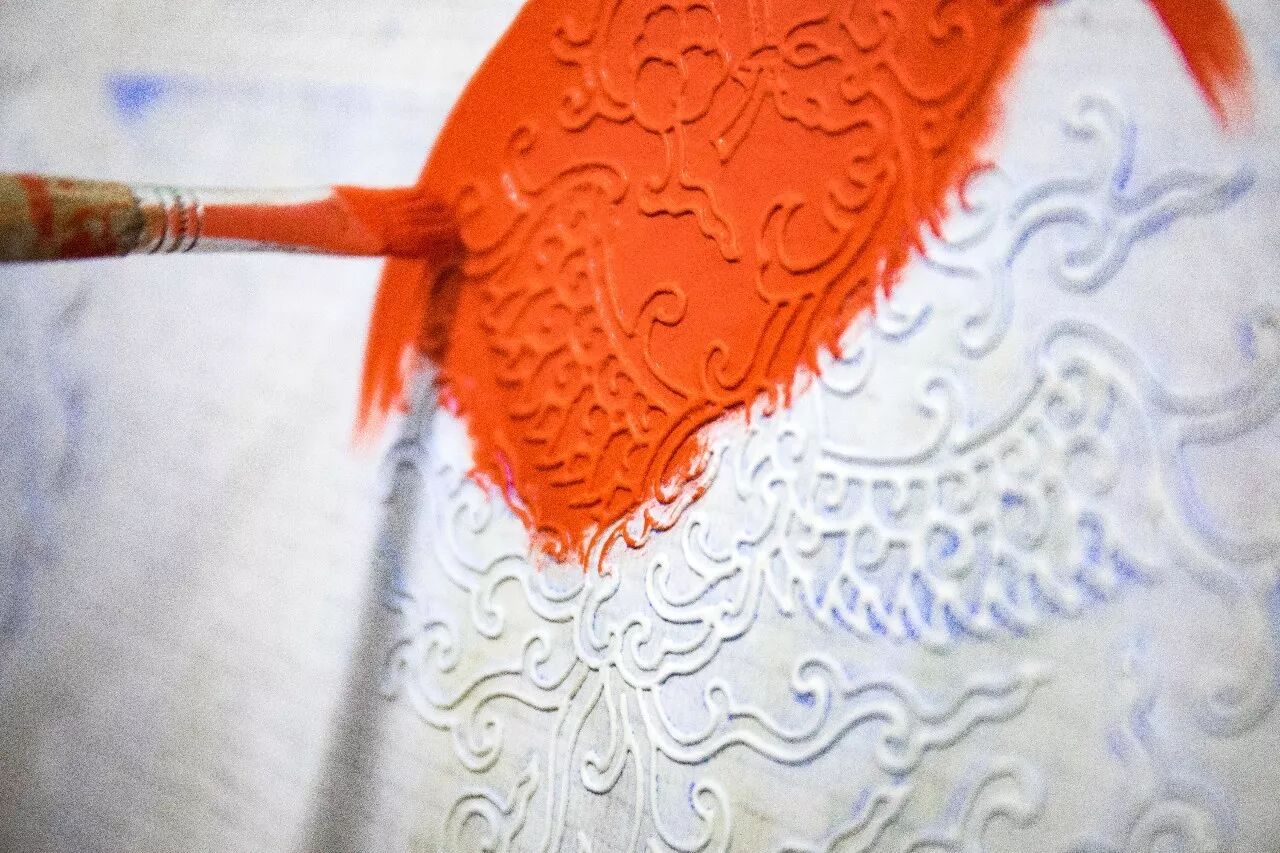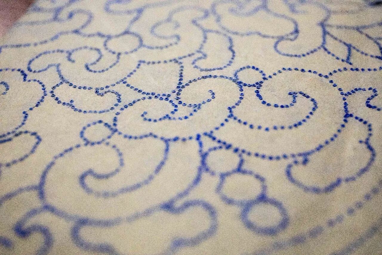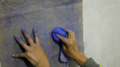 ▲ 扎谱子就为拍谱子。手艺人拿着群青色的粉包,将谱子拍到建筑壁面上。
