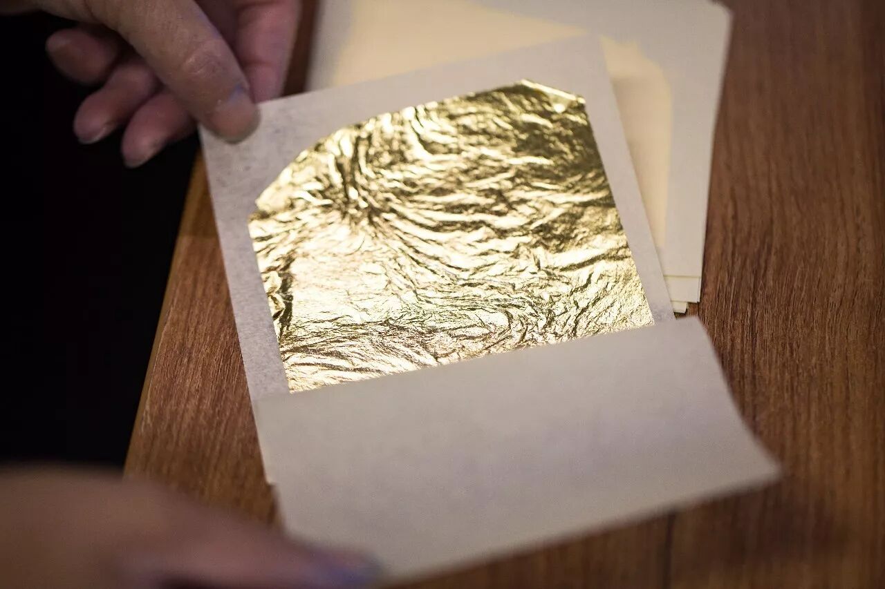▲ 贴上金箔。彩画用金量的多少,根据所描绘建筑等级的高低而定。
