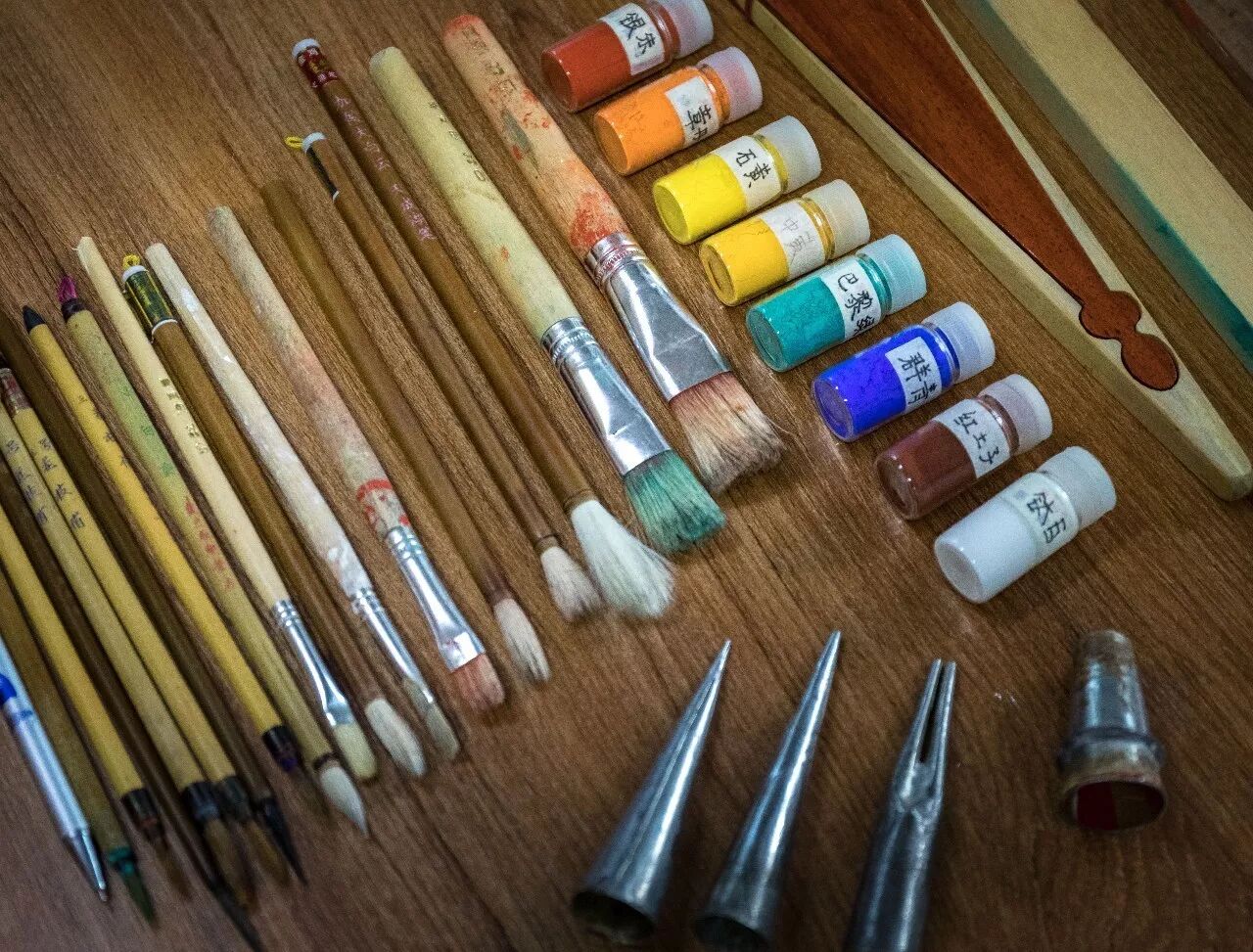 ▲ 这是古建彩绘师王光宾工作用的工具,也是这行当手艺人一生离不开的玩意。