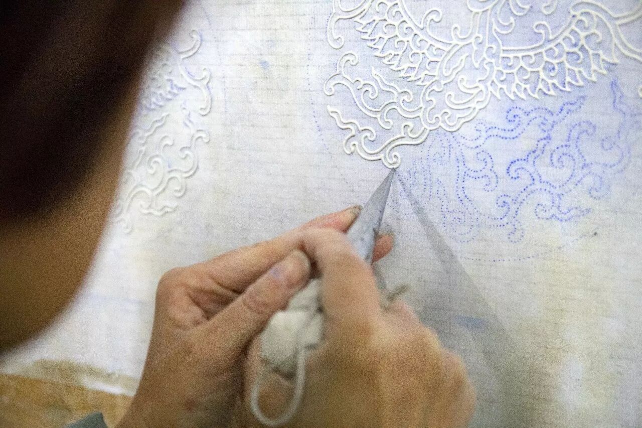 ▲ 每在建筑上彩绘时,都要在一张牛皮纸上画稿,即“起谱子”。起了谱子之后,要用锥子将谱子上的图案全扎一遍。