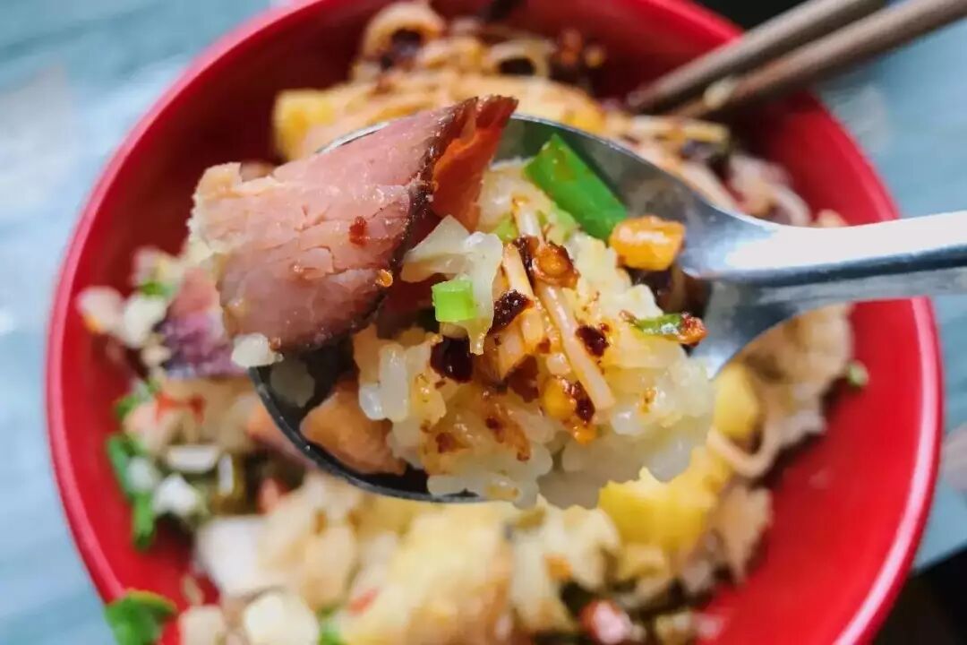 糯米饭醇韧,同时辅以腊肉、脆哨、油辣椒、香葱、榨菜末、折耳根、花生米、豆腐干……可以干拌来吃,更有嚼头韧性、油而不腻,