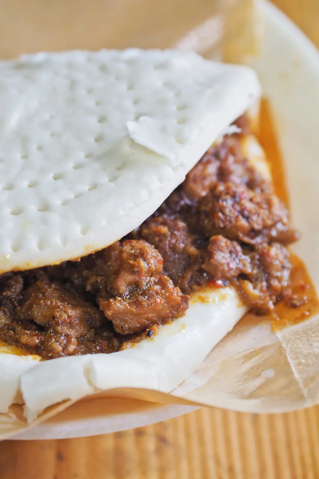 绵软浓香的卤猪肉夹在油香酥软的油旋烧饼中,或是嚼劲十足的干烙饼子里,造就了陕北版的肉夹馍——卤肉夹干烙和猪头肉夹油旋。