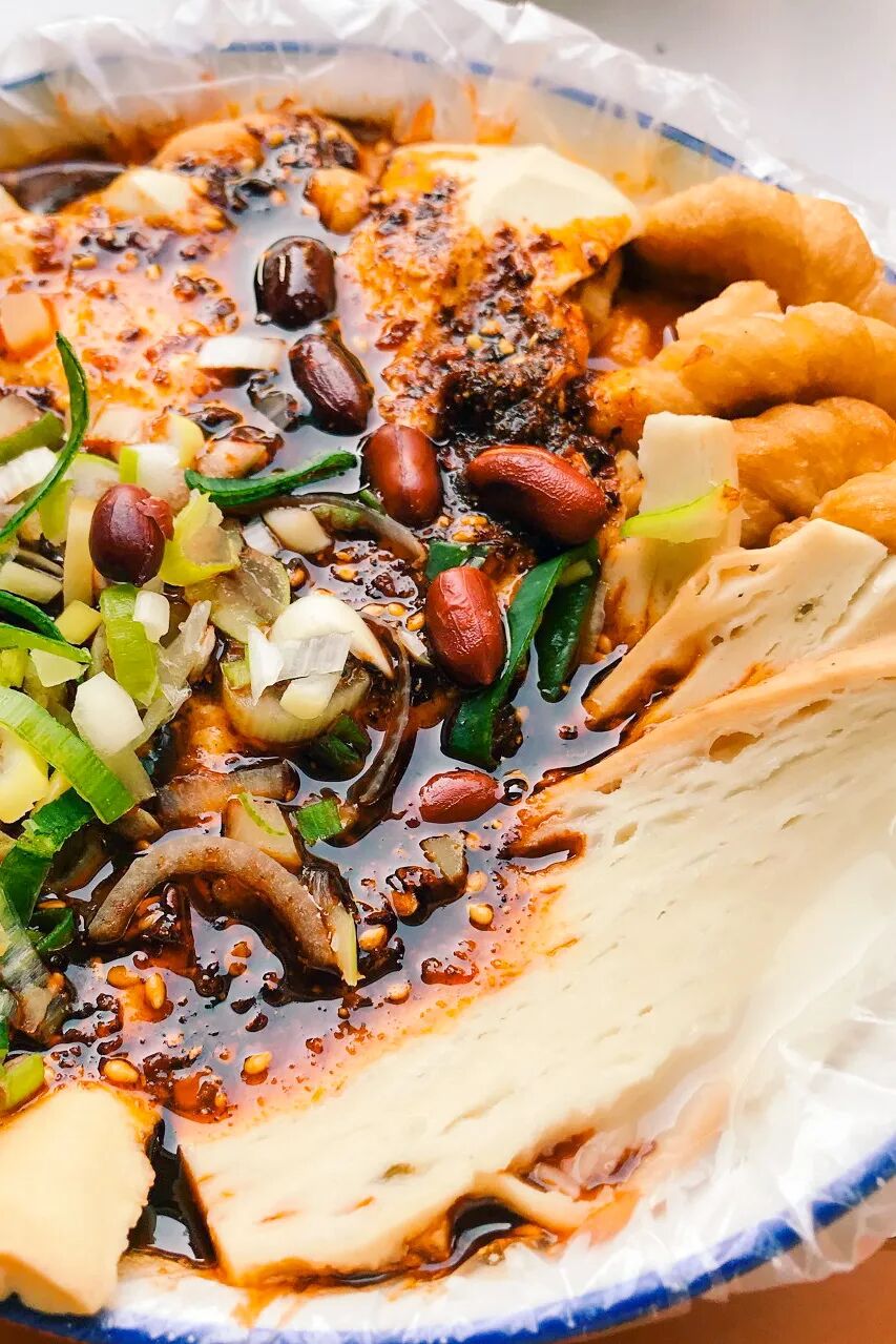 但也有达成共识的:菜豆腐是热面皮的最佳搭档。这是一种用酸浆水点出的豆腐,或直接带着汤水舀上一碗上桌,或再加一些大米熬成稀粥状再食用。