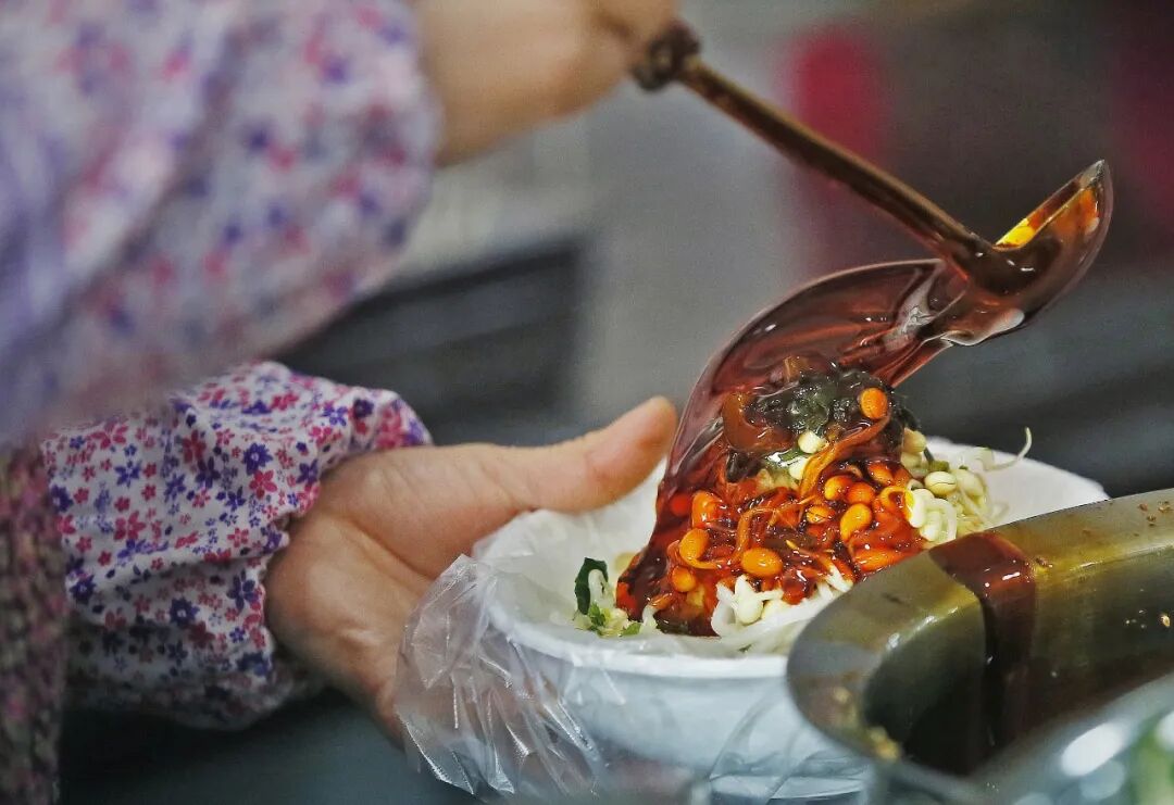 冬季的早晨,将调料水加热后再调凉皮,叫上一碗热乎的鸡蛋醪糟或者苞谷糁,肠胃也变得暖和起来。