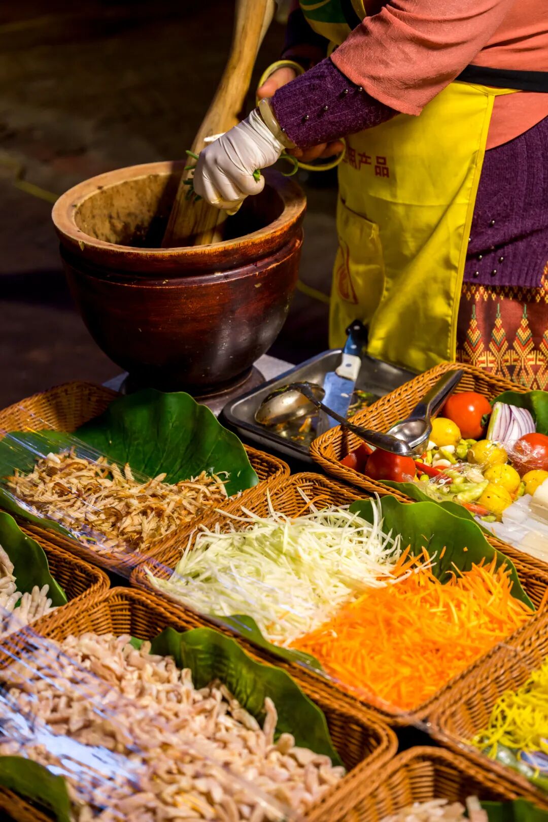 舂,是傣族人对食物的独特处理方式。将食材放在石臼或竹筒里捣碎之后再加入柠檬、小米椒、香草等调味料。在西双版纳的傣味菜里,凉粉、木瓜、鸡蛋、鸡脚……只要是天地所生的万物,皆可舂之。
