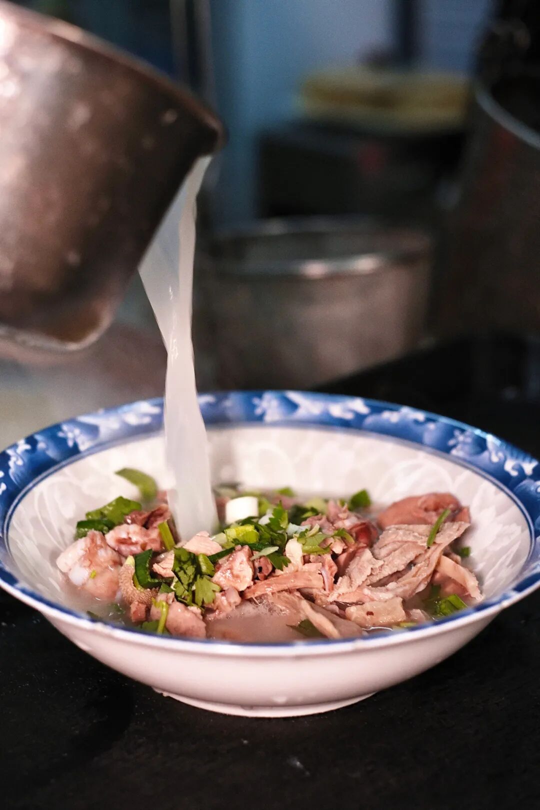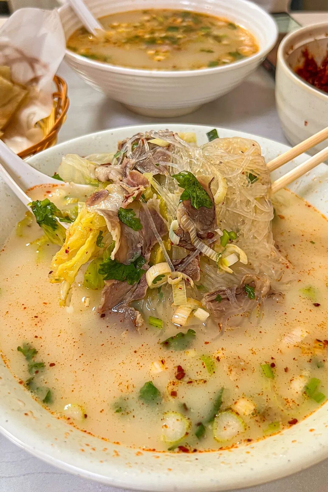 青瓷盆中,清澈的羊汤浮着点点油花,厚厚的羊肉片码放其中,瘦肉细嫩软烂,肥肉晶莹剔透,仿佛一座“肉假山”立在着小小的“汤泉”之上。滴几滴红彤彤的辣椒油,和青葱香菜相映成趣,红得热烈,绿得清新,冬日里喝上一口,烦恼也随热气扩散出去。