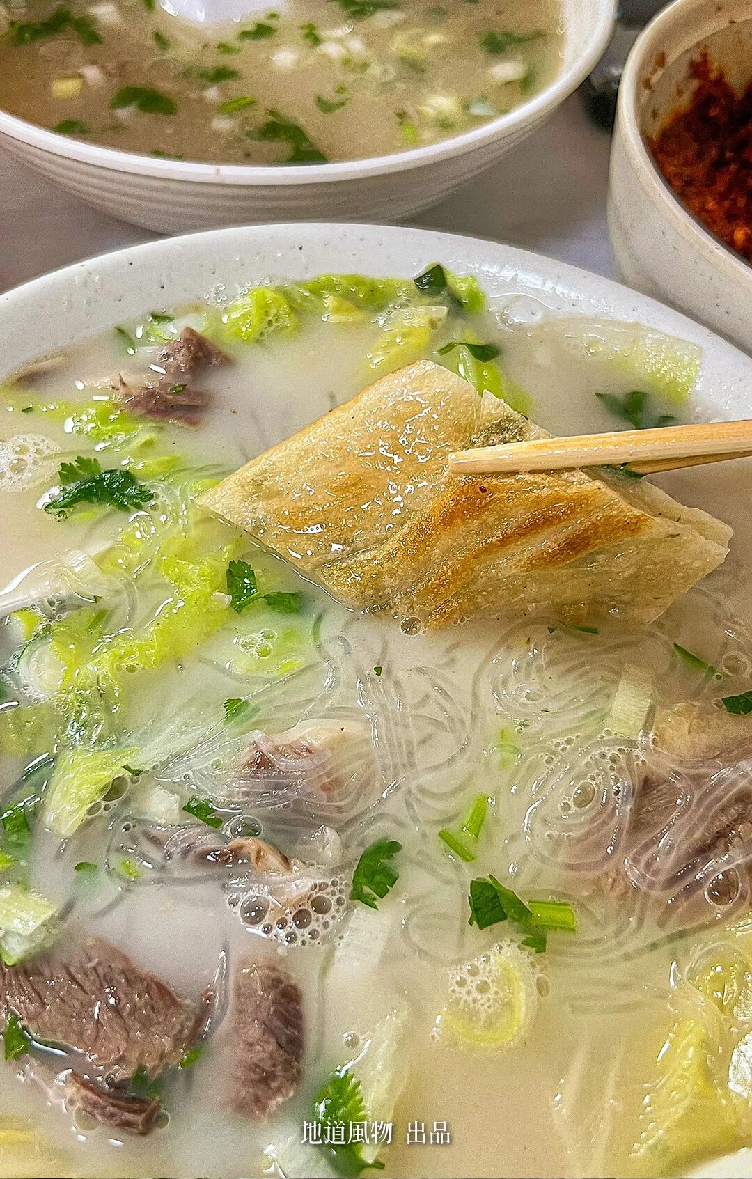 陶碗里,刚盛出的羊汤还微微沸着,大块的羊肉浮泛其间,喧腾而热闹。炖的软烂的白菜如玉石般滑润,透明的粉条缠绕着肉与菜,诉说着味道的羁绊。嗞上辣椒油怦然作响,米醋还未及将乳白的汤汁染色,稍一搅拌,激发出来的香味宛如分子冲锋,直入鼻腔。