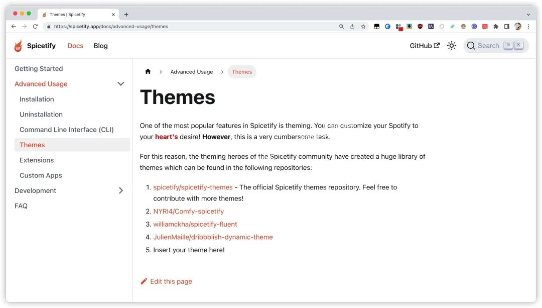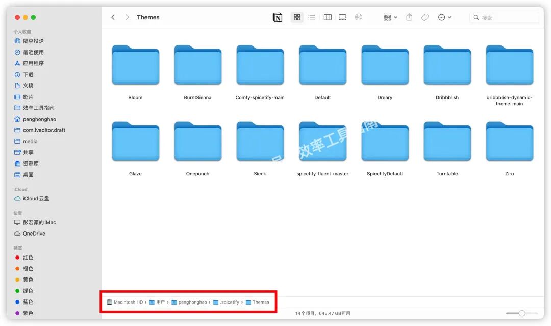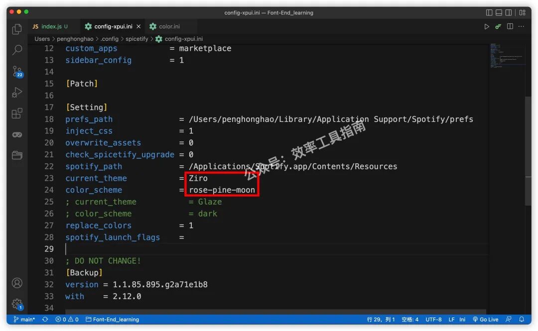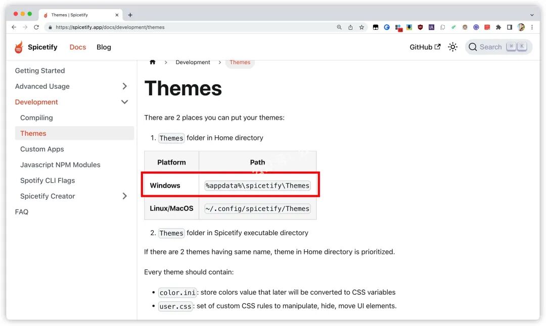 .spicetify 下的 Themes 文件夹中,使用 Linux 或 macOS 系统的朋友,可以参考下图的路径。config-xpui.ini。用户/用户名/.config/spicetify 路径下。config-xpui.ini 时,可以使用 VS Code 或任意一款文本编辑器(例如 Windows 上的记事本)打开这个文件。color.ini 文件。color.ini 文件,打开后的文件如下图所示。red-light 是一种配色方案,rose-pine-moon 是另外一种配色方案。config-xpui.ini 对应的两个字段中。spicetify apply,按下回车键确认更改 Spotify 主题,当下方返回「Spotify is spiced up!」,则说明已经完成主题的更改。