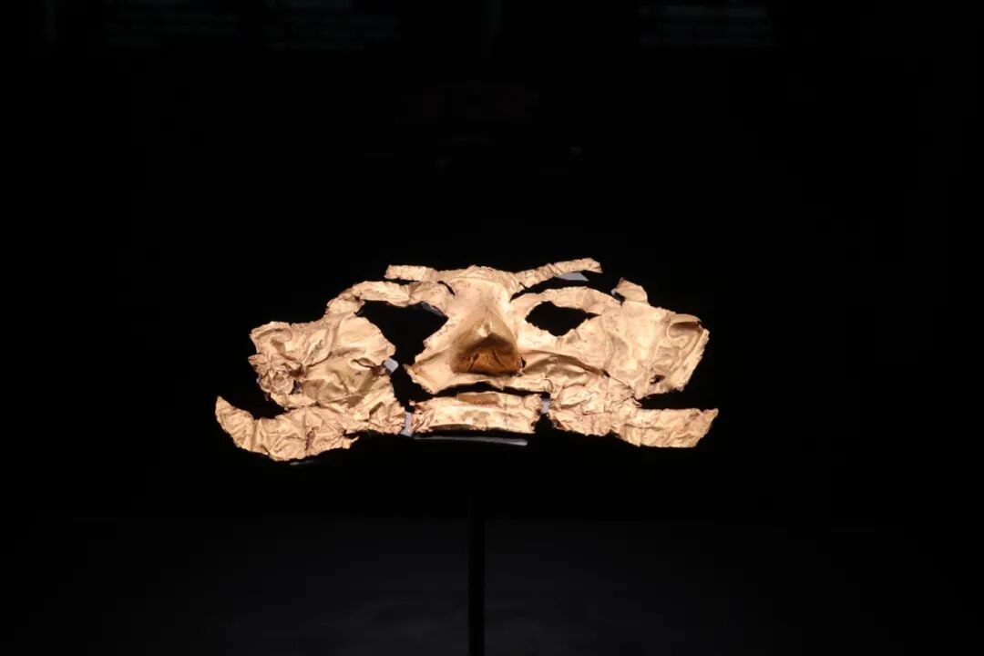 像这件金面罩,以金箔捶拓而成,现场观赏时能看出它相当薄,其大小与同坑出土的人头像面部比例基本吻合,可相匹配。