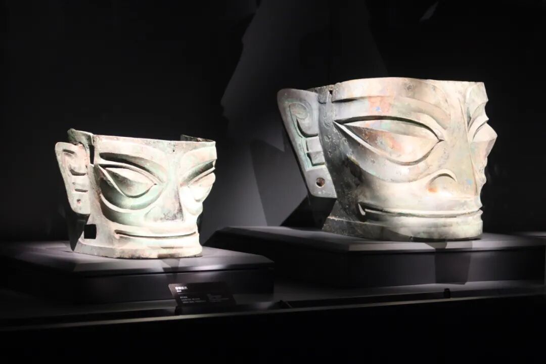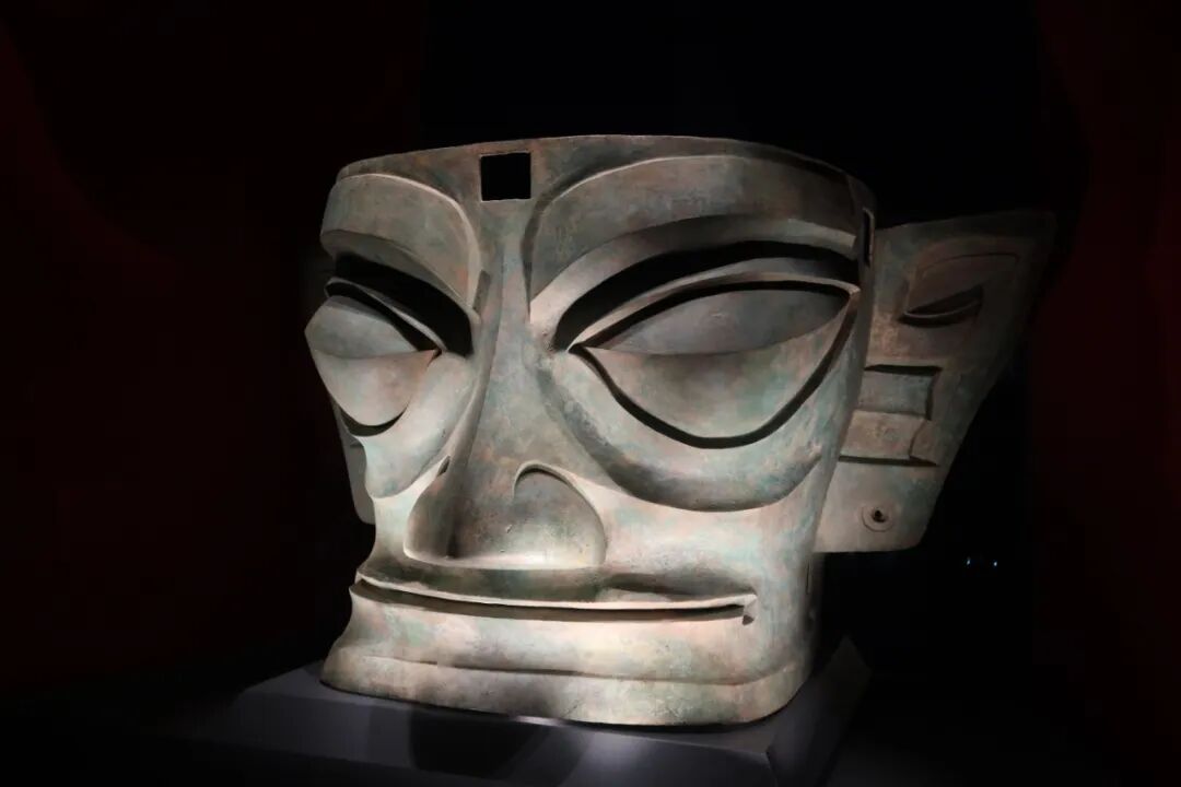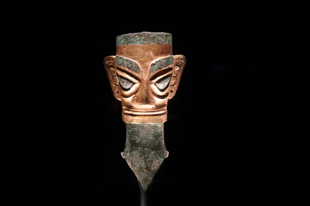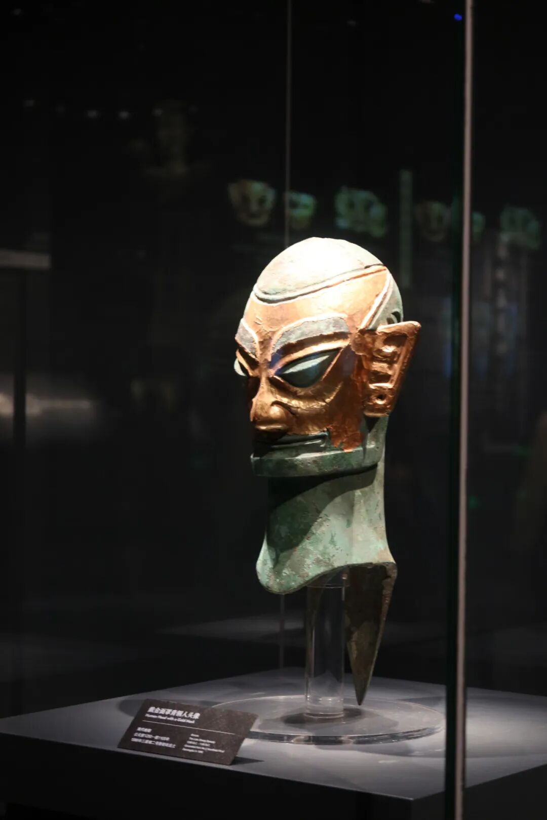 也有戴金面罩青铜人头像,眼眉部镂空,给人以权威与神圣之感。三星堆青铜人头像上包贴金面罩,与古蜀人的宗教习俗有密切关系,且说明当时的古蜀人已视黄金为尊。