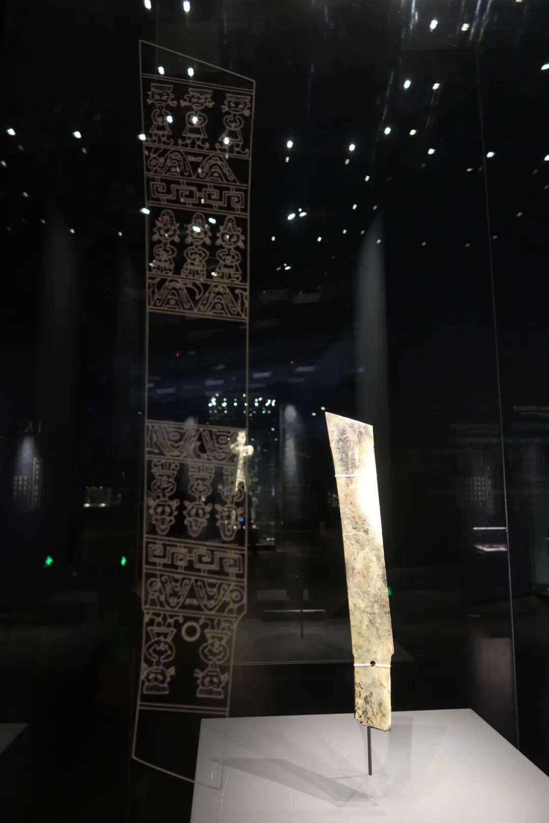 玉璋上有用阴线钱刻的对称图案,表现了庄严隆重的祭祀场面。馆方把璋身图案展示在玻璃展柜上,方便大家观赏。