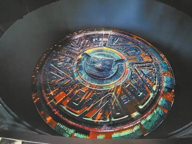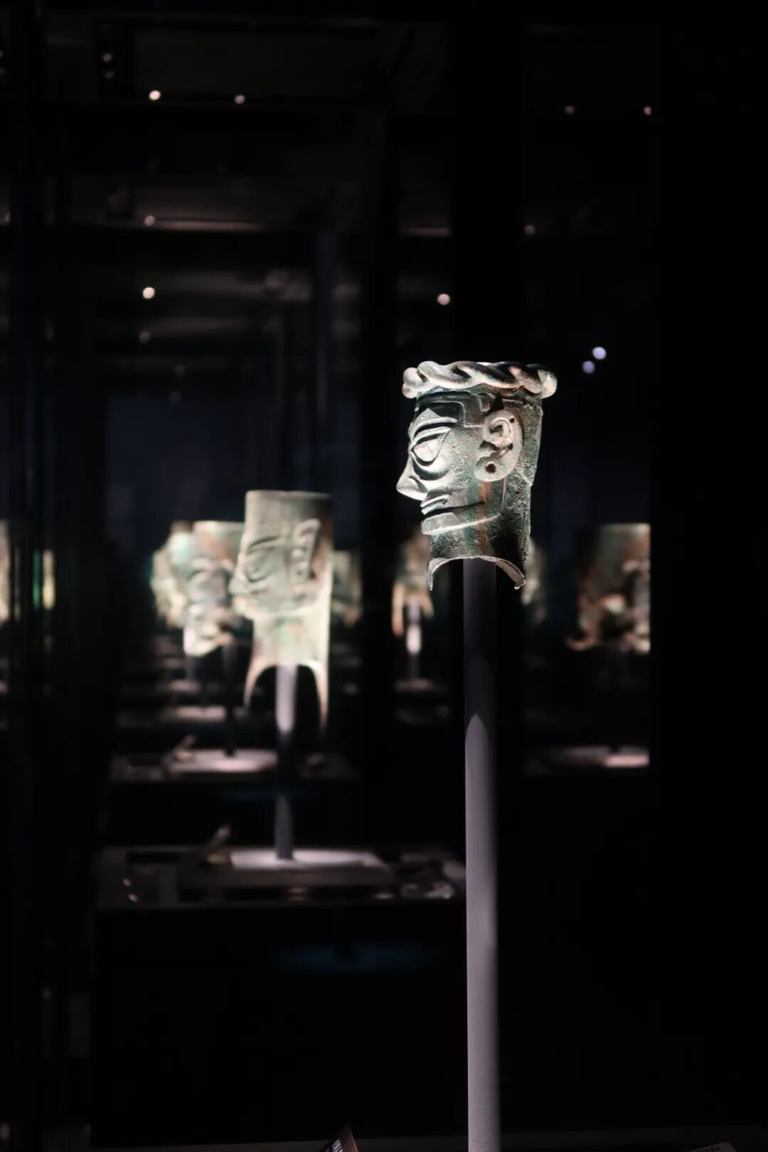 刚提过的镇馆之宝青铜纵目面具被单独放置在一个一米高的展台上,面具背后是星空图案背景。我们仰视着古蜀先民,而古蜀先民仰望着星空。在那个物质极度匮乏的年代,先民们依然充满勇气和希望。