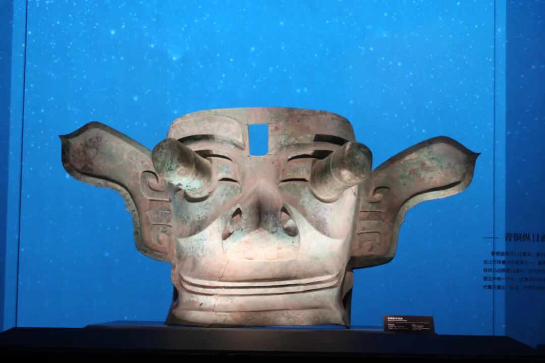 这件青铜纵目面具高0.66米,宽1.38米,有着阔眉大眼、鼻高而宽、双耳尖长的相貌。冷峻肃穆的面容和巨大的体量令人感到无边威仪。考古学家判断这件文物可能是放在古蜀国祭祀活动现场,是王国重器。