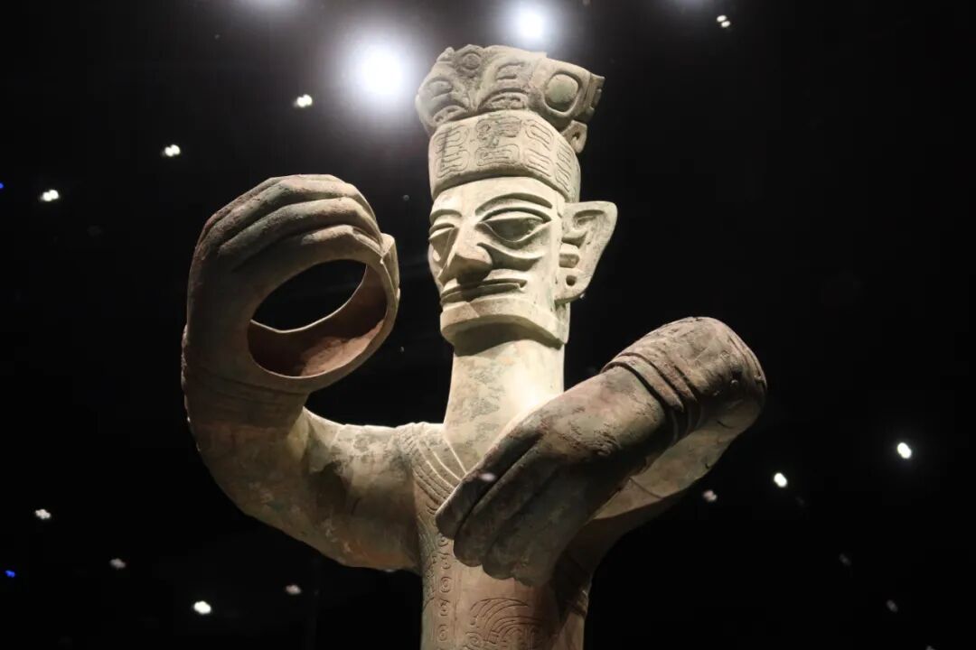 这是整个三星堆最具标志性的文物之一。它通高约2.6米,人像部分高1.8米,头戴高冠,衣上纹饰繁复精丽,神情庄重威严,手中所持物件至今未有定论。专家倾向于认为它是古蜀国集神、巫、王于一体的领袖人物。