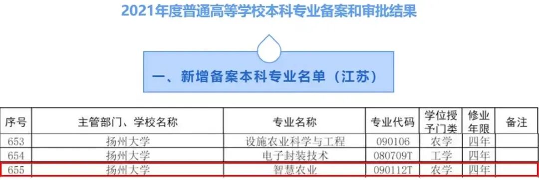 专业荣誉:扬州大学瞄准国家战略需求,根据现代农业发展趋势,2003年在全国率先设置了农学(农业信息技术)招生方向,2022年正式获批智慧农业专业。近20年来,为社会培养输送了了一批智慧农业专业人才,为国家农业信息化、智能化和智慧化发展作出了重要贡献。