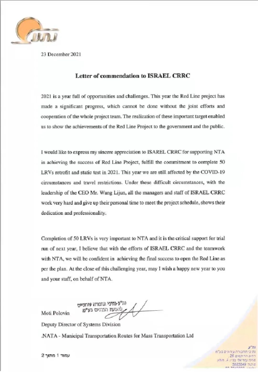 2021年,以色列中车长客公司面对挑战、肩负重压、合作奋进,全力满足客户需求,全面完成全年经营目标,并圆满兑现以色列特拉维夫红线轻轨项目的重要里程碑节点。为此,以色列特拉维夫都市区公共运输有限公司(NTA)发来表扬致谢信,对以色列中车长客公司给予最大的肯定和认可,由衷的表示感谢和敬意。