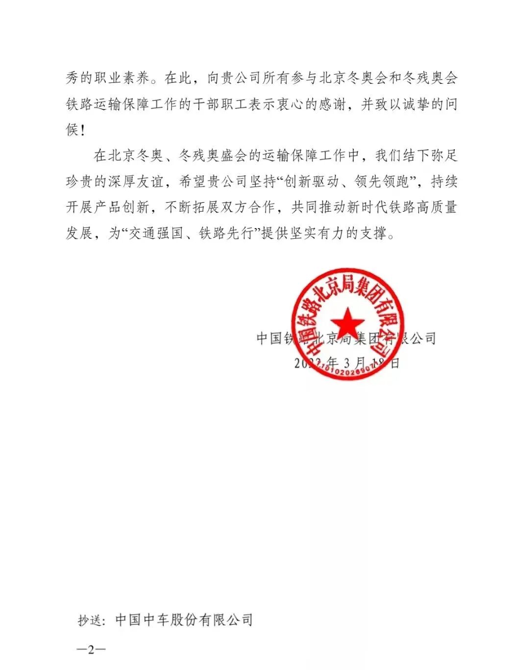 近期,列车的研制单位中车长客股份公司收到了北京冬奥组委、中国铁路北京局集团有限公司以及中央广播电视总台发来的三封感谢信,三家单位对公司量身定制的北京冬奥列车以及公司为车辆改造、运营保障所付出的巨大努力给予了充分的肯定和感谢。北京冬奥组委在感谢中提到,北京冬奥盛会期间,由你们组织研制、运营并提供服务保障的北京冬奥列车顺利完成了连接核心赛区的交通任务,打造了世界首个时速350公里的奥运直播间,成为北京冬奥会上的一张亮丽名片,为奉献一届“简约、安全、精彩”的奥运盛会作出了重要贡献!中国铁路北京局集团有限公司在感谢信中特别提到,贵公司心怀国之大者,充分展现了国企的政治意识、大局意识和责任担当,组建了超过300人的现场保障团队,展现了良好的精神风貌、高超的技术能力和优秀的职业素养。中央广播电视总台的感谢信专门提到,由贵公司联合总台创新建设的高铁5G超高清演播室正式运行。这是全球首次在350公里时速的高铁列车上,依托5G技术打造超高清直播演播室,实现超高清信号的长时间稳定传输。本次合作充分体现贵公司高度的政治责任感和优质的服务保障能力。三封感谢信分别从赛事交通服务、车辆运营维护保障以及车辆技术创新等方面赞扬了中车长客股份公司在赛事期间展现出的高度责任感和专业精神,为公司在列车运营保障工作中付出的巨大努力表示感谢。1月6日,由中车长客股份公司研制的北京冬奥列车正式亮相。列车在世界上首次实现时速350公里的无人驾驶,首次应用我国自主研发的北斗卫星导航系统,具备车站自动发车、区间自动运行、到站自动停车、车门自动控制等先进功能。同时列车还具有智能服务功能,车内温度、灯光,甚至是进入隧道时的压力波都能够自动调节,为乘客带来智能舒适的乘车体验,被众多网友誉为“国货之光”。