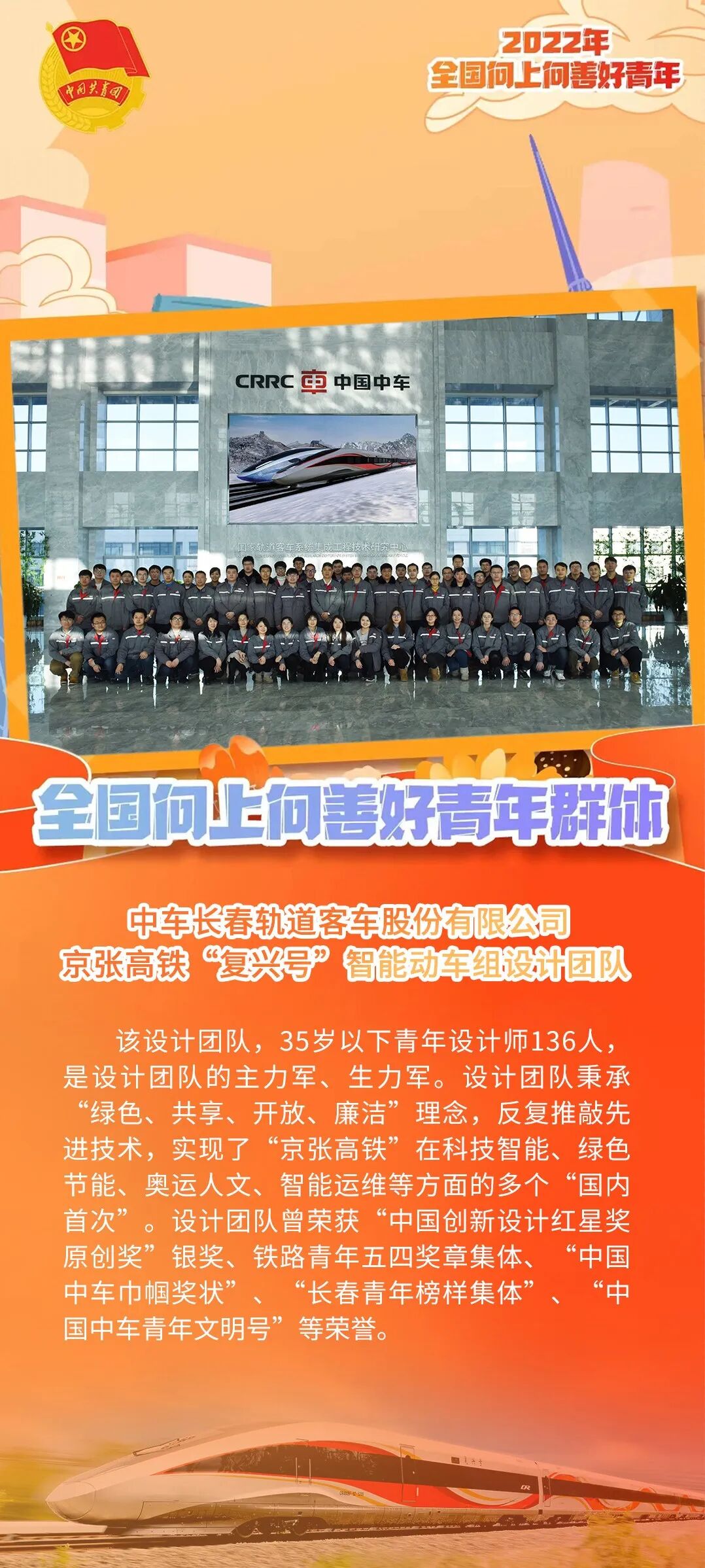 2017年以来,为贯彻习近平总书记将2022年北京冬奥会举办成一届精彩、非凡、卓越的奥运盛会的指示精神,中车长客股份公司组建了由中车科学家、首席专家、骨干设计师组成的京张高铁“复兴号”智能动车组设计团队(以下简称设计团队),其中35岁以下青年设计师136人,是设计团队的主力军、生力军。