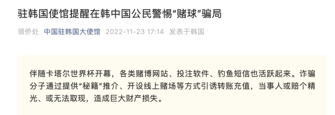 原标题:《驻韩国使馆提醒在韩中国公民警惕“赌球”骗局》