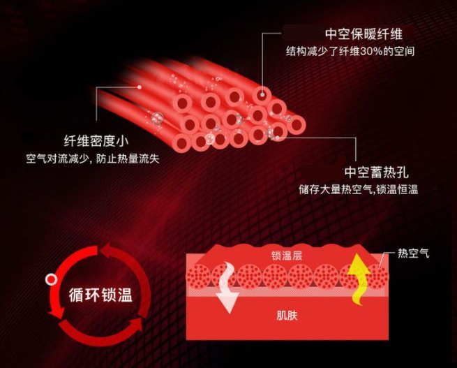 采用蓄热保暖的中空纤维,将人体挥发的热量牢牢锁在中空纤维锁温层,让身体里产生温暖的小太阳。