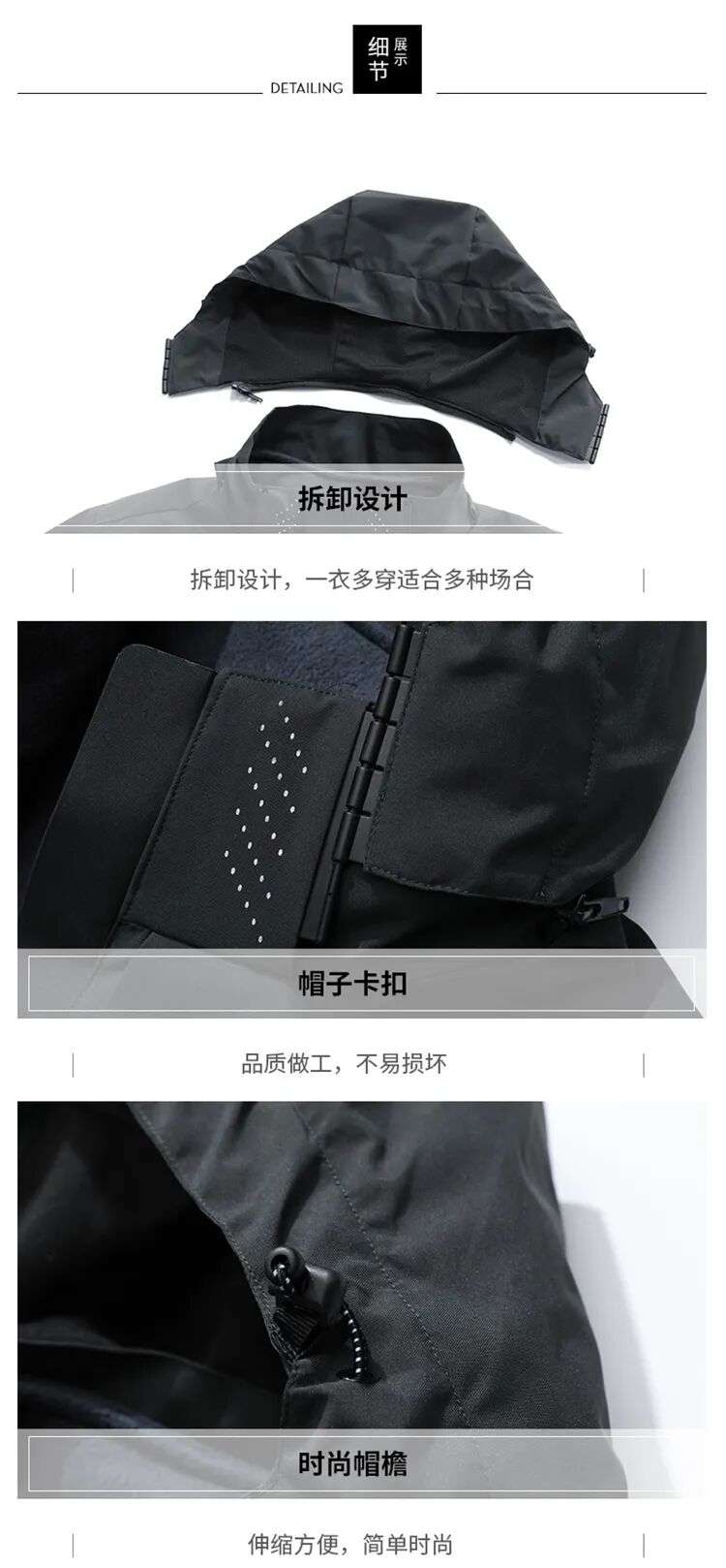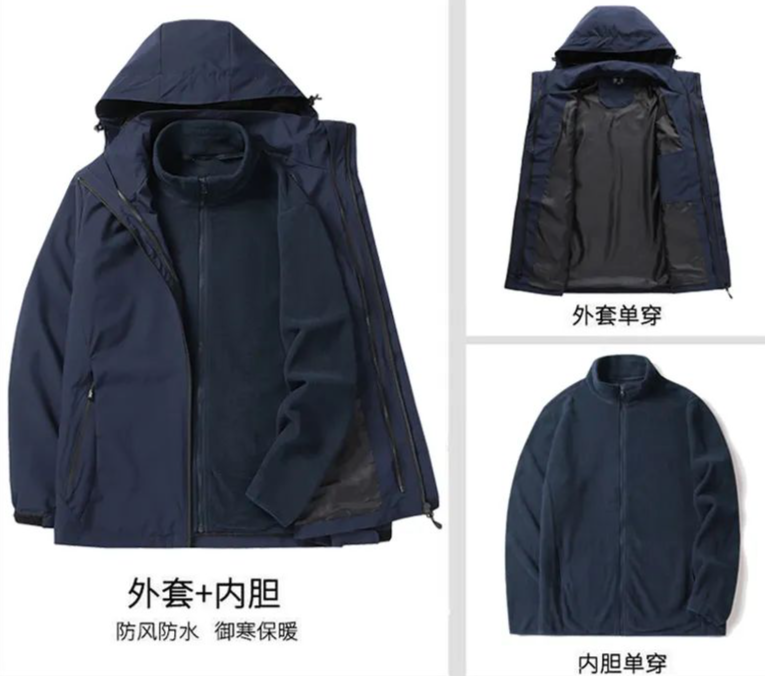 外衣、内胆、可拆分的设计,符合一年春、秋、冬三季的穿着。