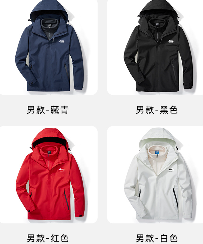 一件衣服,就能应对春秋冬三季各种气候变化,性价比超高!无论户外运动、日常通勤,都是“全天候”必备之选!防水、防污面料,特殊面料抵御寒风的同时也给身体带来干爽的温暖,称得上是“冲锋衣届的扛把子”。打破了传统面料的局限性,采用市面领先的防水黑科技——仿荷叶拒水拒污科技,使衣服表面能拥有像荷叶一样滴水不沾的性能。水泼过来就像给身体穿了一层防护服一样,污渍和水碰到衣服料身就会迅速弹开。再模拟污渍来袭,直接往衣服倒上可乐也一样,擦几下就干净了。雨渗不进来、冷风也几乎灌不进去,这是和它同等的冲锋衣绝对做不到的防水防风保暖性。且不捂不闷,jeep spirit工厂进口德国针织机,可以通过极细的针孔织造出微米级别的网格孔。虽然是网格孔,但是却能做到让风有孔不入,还大大提高了透气效率~汗水湿气也能透过面料迅速排出,不闷不捂,长时间户外锁住体内热量,不必担心高寒湿温现象。不仅如此,它的面料厚实耐磨又抗撕,刀尖都划不破!在严苛的户外环境中,能给你周全的保护。和动不动起球的羊绒大衣,脏了又没法洗羽绒服相比,它显然省心得多!穿2年、3年、4年,还和第一次穿一样防水防污耐磨,仿佛每年都穿新衣服。作为大牌服装品牌,在衣服的细节上自然也是诚意满满。立体裁剪,带一点修身的版型,视觉上有修饰身材比例的效果,穿着不显肥大,藏肉效果一流~实用的防风立领设计搭配可拆卸帽子,你可以根据自己的需求来调节哟~不戴帽子的时候是半高领设计,让裸露的脖子不受凉、防倒灌风,也不会过长让人穿着觉得不舒服。走线细密平整,拿放大镜都挑不出多余线头,品质不输千元奢侈品牌。胸前隐藏式口袋+两侧压胶设计,干净利落,还能抵御寒风。还有一些设计上的小心思,比如胸前的印花、后背的暗纹,恰到好处地消除了衣服的沉闷感,时尚感又加几分。冲锋衣上的帽子做了抽绳设计,佩戴的时候可以自由调控头围大小。袖口处采用微弹收缩设计,能阻止冷风灌入,保暖性更好。
