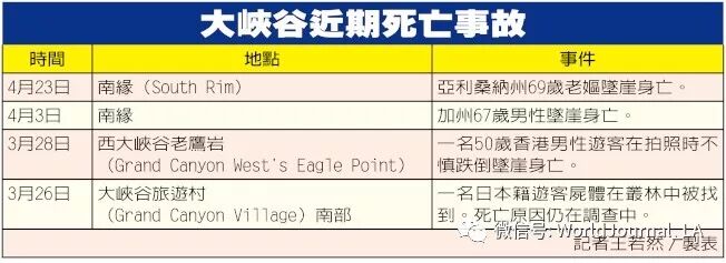 这已经是大峡谷3月下旬以来第四起坠崖事故。上月28日在西峡谷,有一位来自香港的男性旅客在拍照时,不慎滑倒失足坠谷身亡。遗体在1000多呎的山下找到。