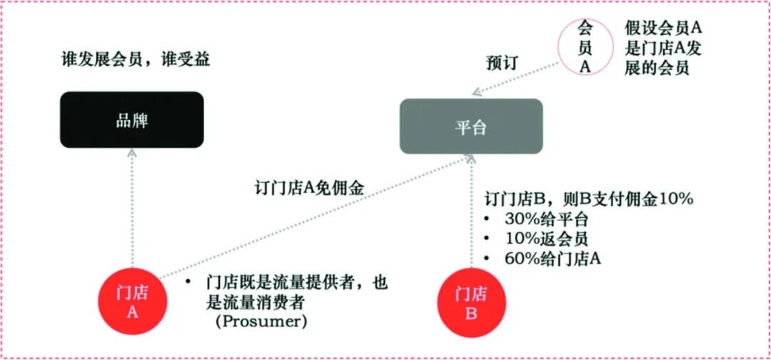 假设会员A是某品牌的门店A发展的,那么当他从平台预订门店A的客房时,门店A不用支付任何佣金给平台,因为这个会员是它自己发展的。但如果他预订了门店B,那么门店B支付给平台的订房佣金(假设是订单金额的10%)中,有一定比例(此处假设是60%)将奖励给门店A。