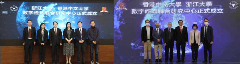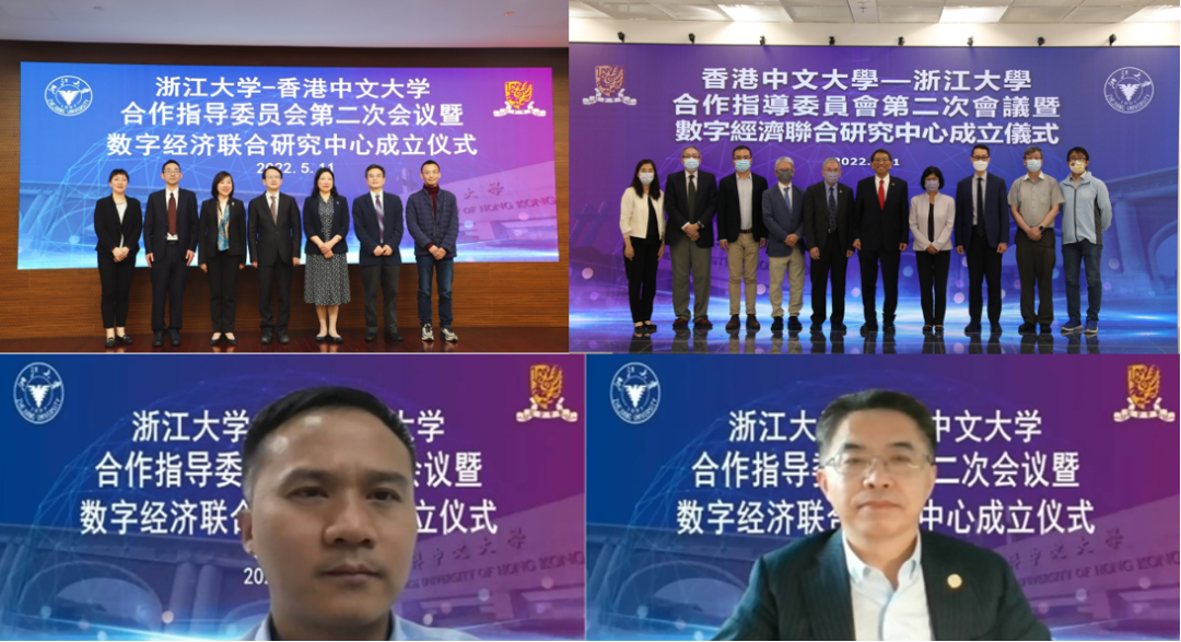 5月11日下午,浙江大学校长吴朝晖院士与香港中文大学校长段崇智教授举行视频连线,召开两校合作指导委员会第二次会议暨数字经济联合研究中心成立仪式。浙江大学副校长何莲珍教授、香港中文大学副校长陈伟仪教授、副校长岑美霞教授及两校相关学院(系)、部门负责人参加。经济学院院长张俊森教授、经济系系主任朱希伟教授、浙江大学-香港中文大学数字经济联合研究中心联席主任汪淼军教授出席了本次仪式。