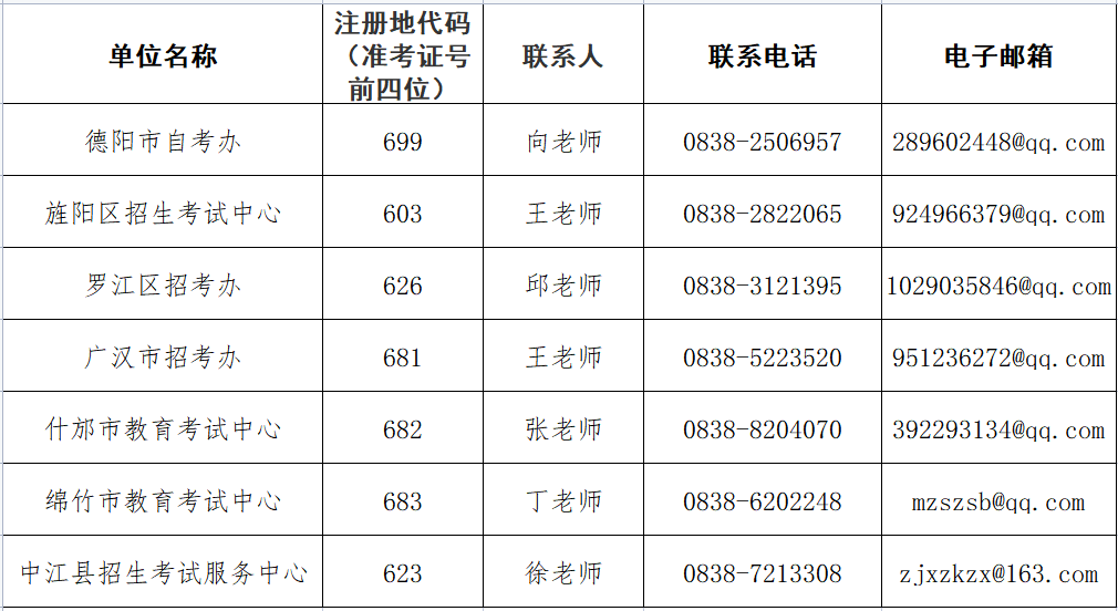 在疫情防控常态化形势下,为便于广大考生线上办理自学考试方面相关业务,按照四川省教育考试院要求,现将德阳市各区(市、县)线上办理自考业务联系方式公示如下。