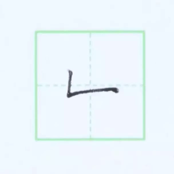 下笔写竖(有长、短之分),顿笔后向右写横,收笔较重。注意竖要直,横要平,一笔写成。如图: