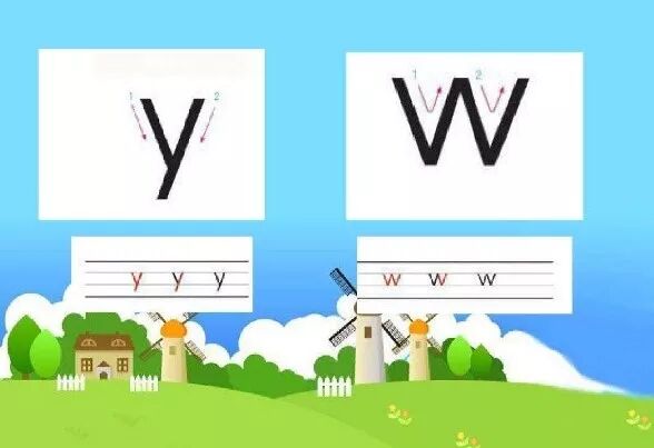 重点指导写 w。w由两个“v”组成,占中格,不要写得太宽。笔画名称:“v”叫斜下斜上。