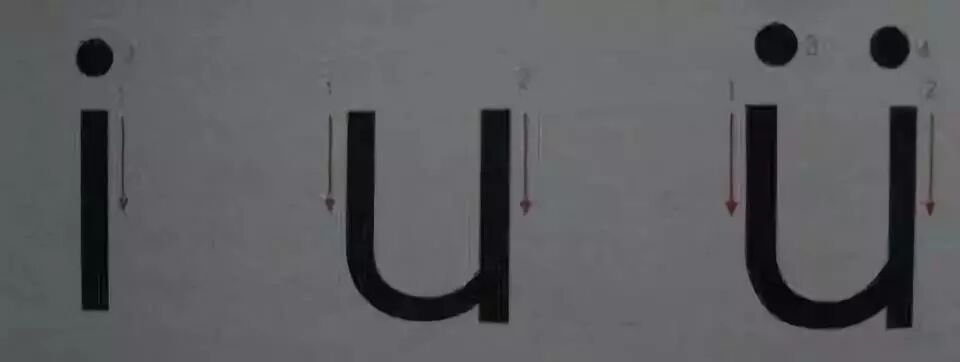 ü 占上中格,两点最后写,写在上格靠近第二条线的地方,四笔写成。