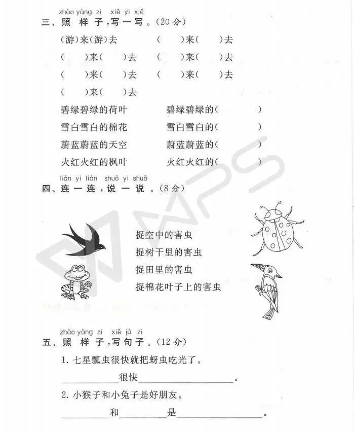 六、1.棉花咧开嘴笑啦! 2.兔子领着大家来到湖边。 3.小壁虎一挣,挣断尾巴逃走了。 4.小壁虎把借尾巴的事告诉了妈妈。