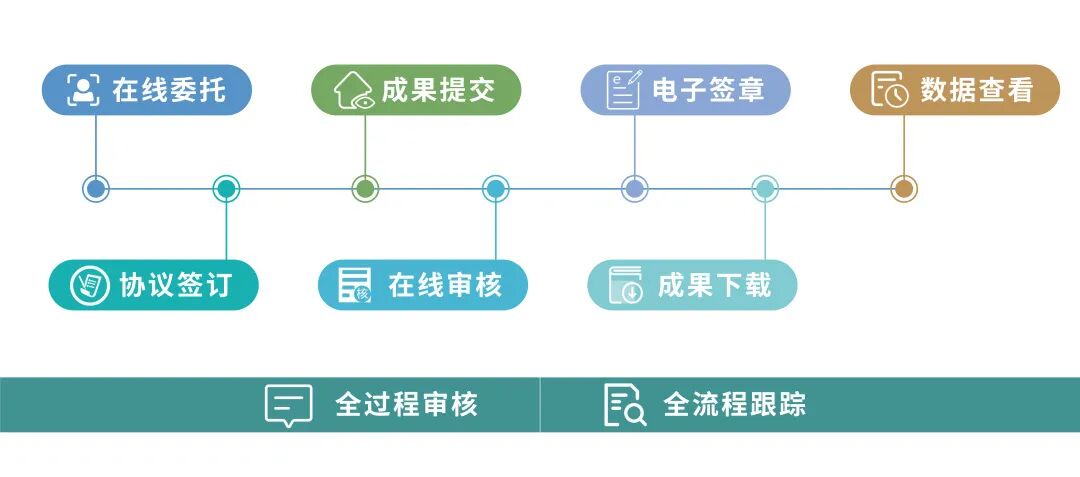 全流程在线办理:在线委托-协议签订-成果提交-在线审核-电子签章-成果下载,实现数据在线传输,全程零跑路的“一网通办”管理模式。