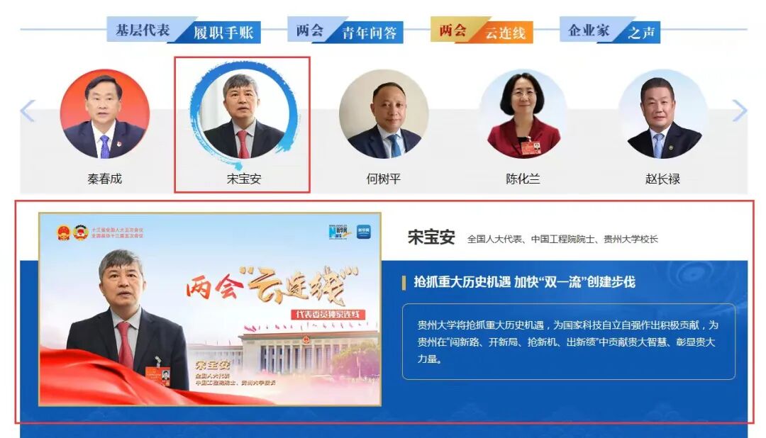全国两会上,全国人大代表、中国工程院院士、我校校长宋宝安,全国政协委员、我校贵州省森林资源与环境研究中心主任丁贵杰认真履职,积极发声。让我们一起聚焦全国两会上的贵大声音。