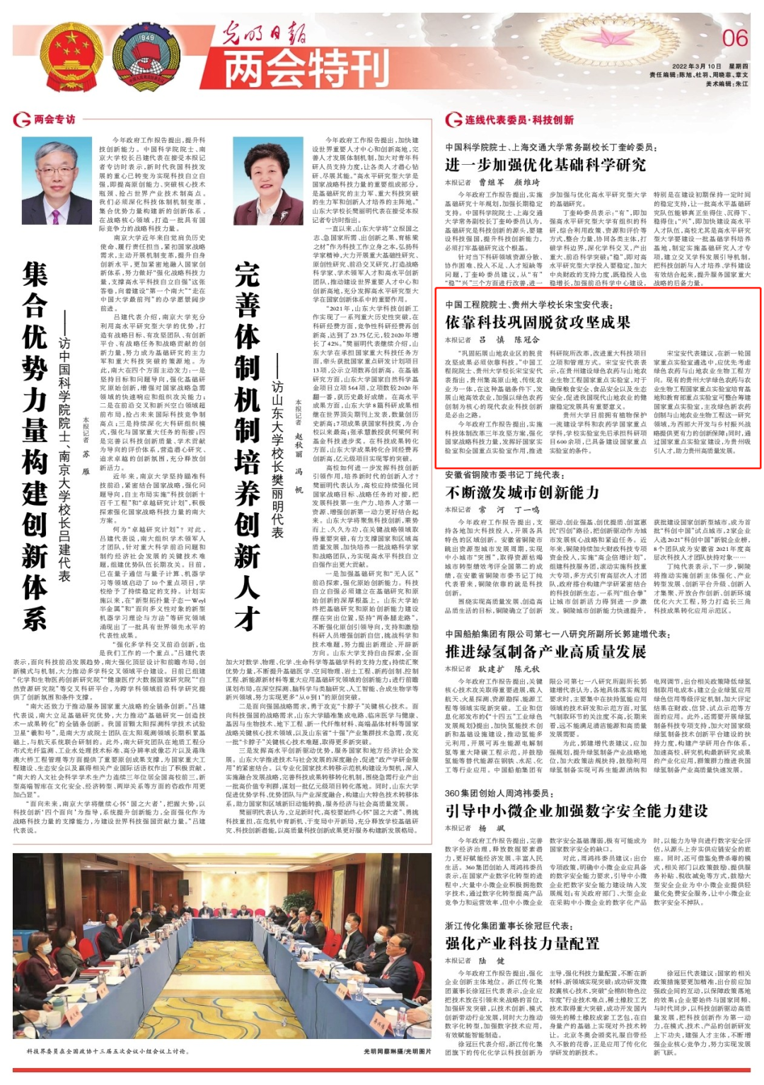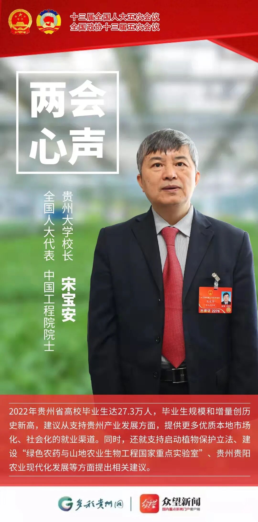 2022年贵州省高校毕业生达27.3万人,毕业生规模和增量创历史新高,建议从支持贵州产业发展方面,提供更多优质本地市场化、社会化的就业渠道。同时,还就支持启动植物保护立法、建设“绿色农药与山地农业生物工程国家重大实验室”、贵州贵阳农业现代化发展等方面提出相关建议。