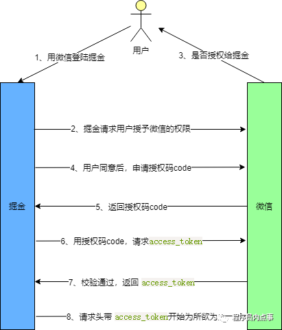 下图我们以用WX登录掘金为例,详细看一下授权码方式的整体流程。